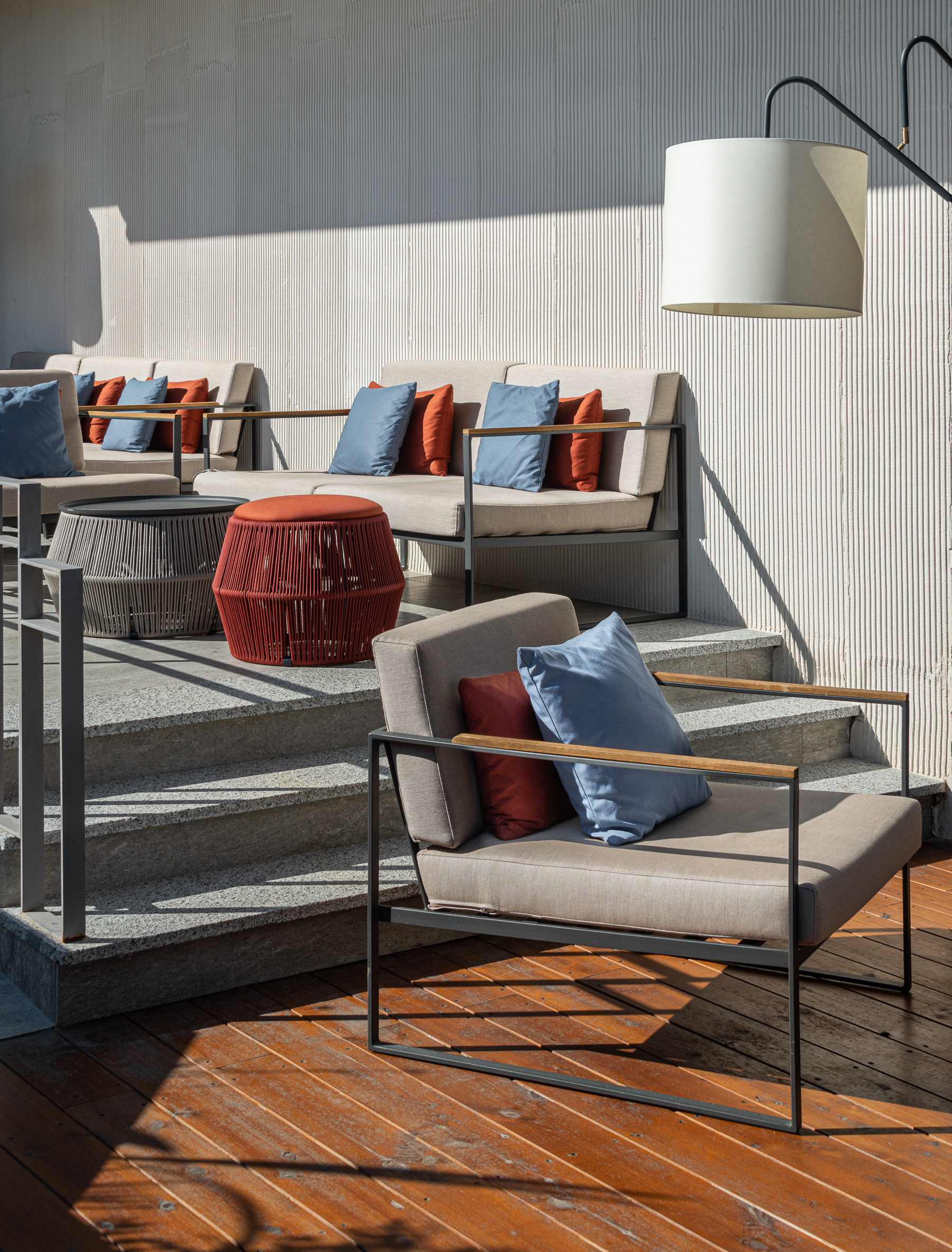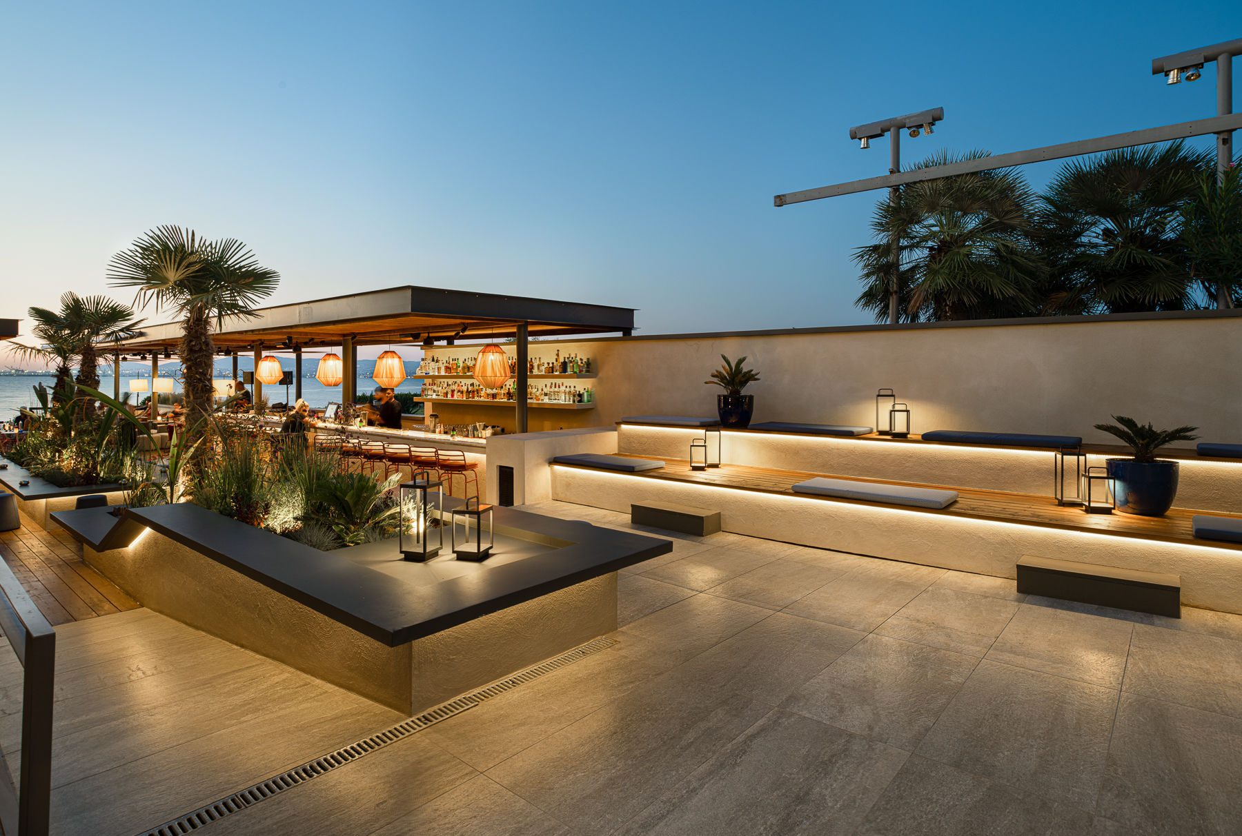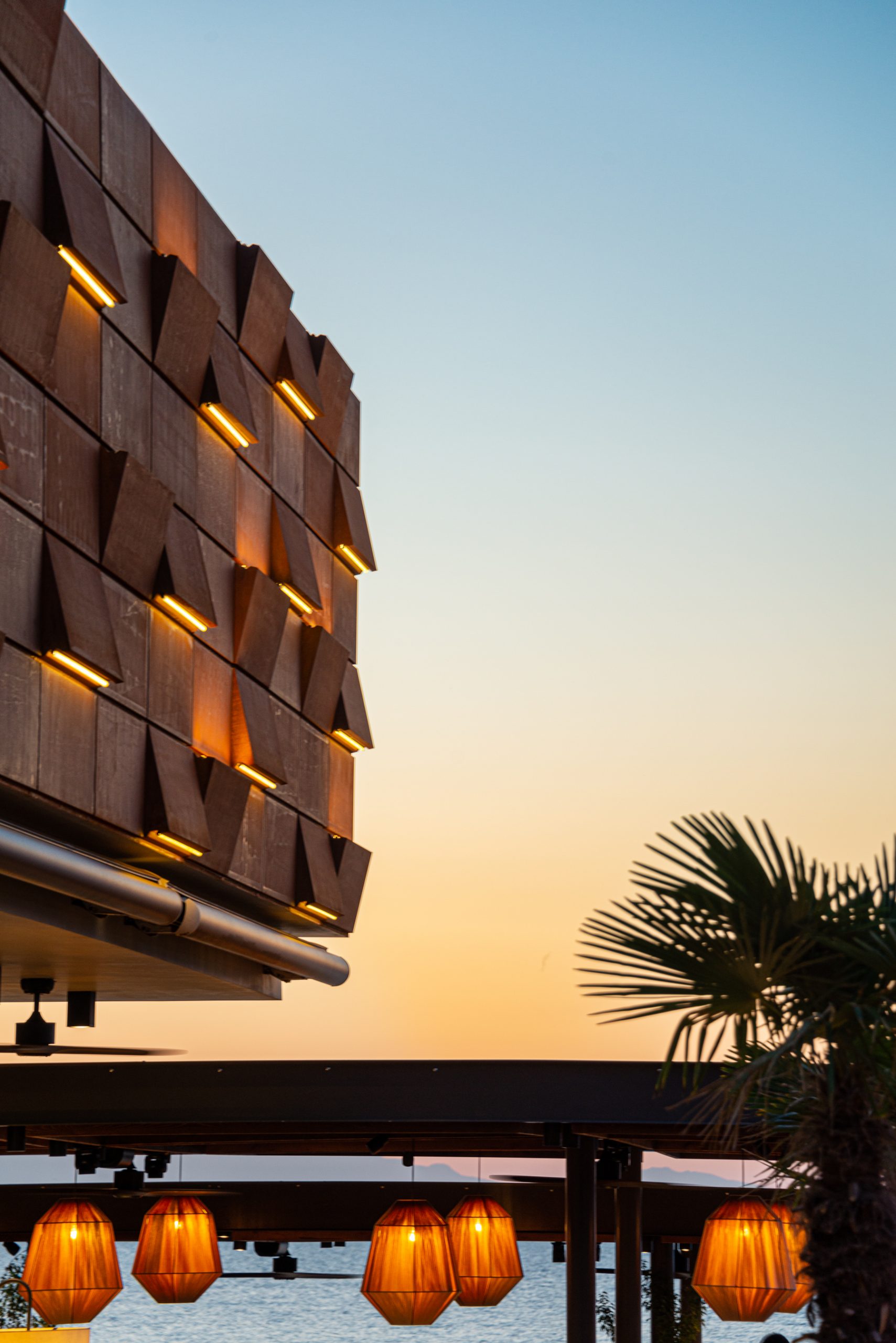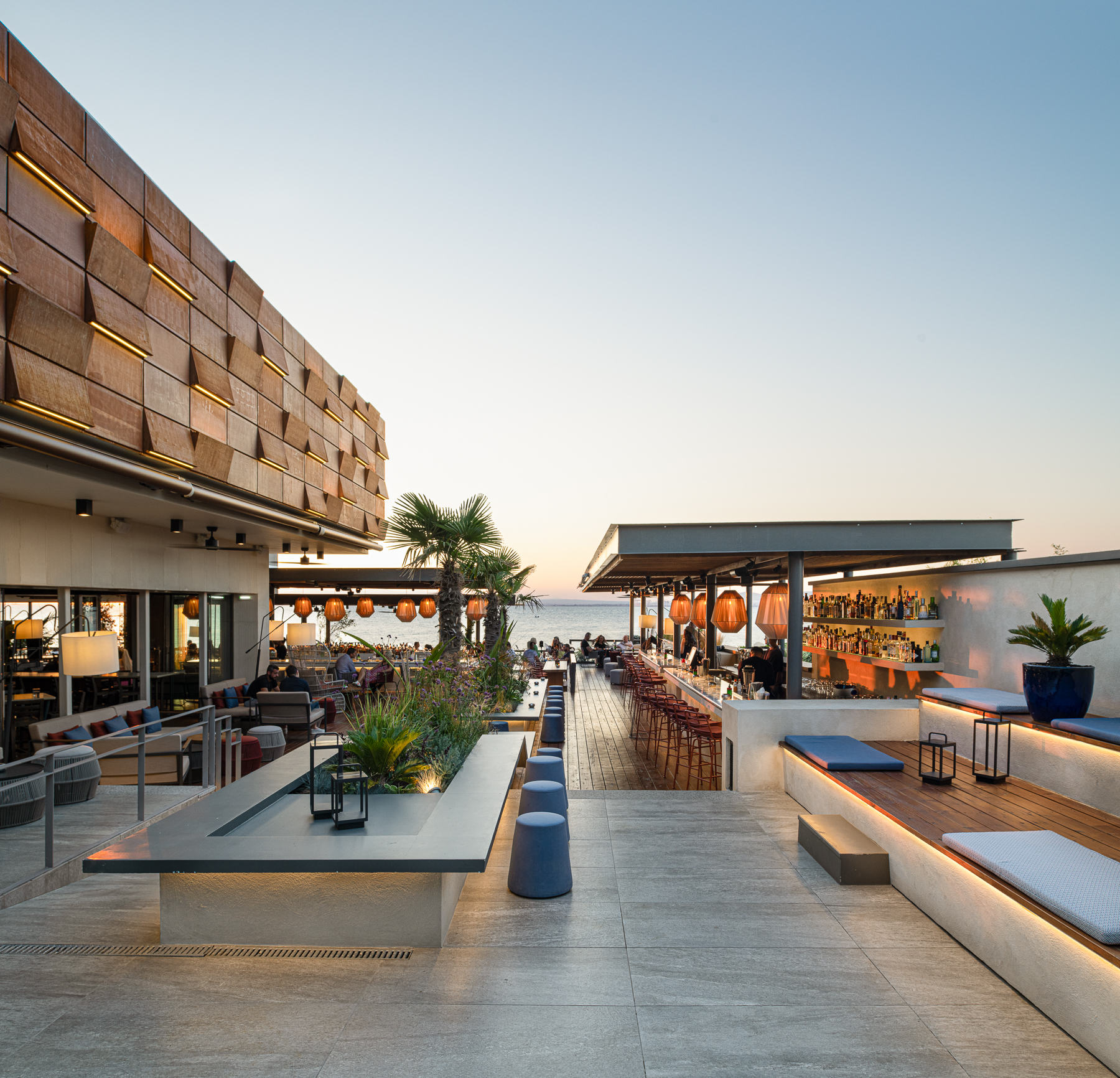 Each visitor goes through a journey upon arriving the site. First point of arrival is the entrance, where large Corten slabs that look like oxidised iron, along with blooming plants, welcome you and lead you down a path to the various sensations that nature can offer. Organic materials are being used in the whole promenade from the entrance, up until the sea front. Timber floors and pergolas, candle lit granite surfaces and tables, outdoor gas fire pits, a rich pal coloured palette of textiles, and a vast selection of plants and trees, make the visitor experience a connection to the earth and in the same time feel the unique and powerful identity of the establishment.