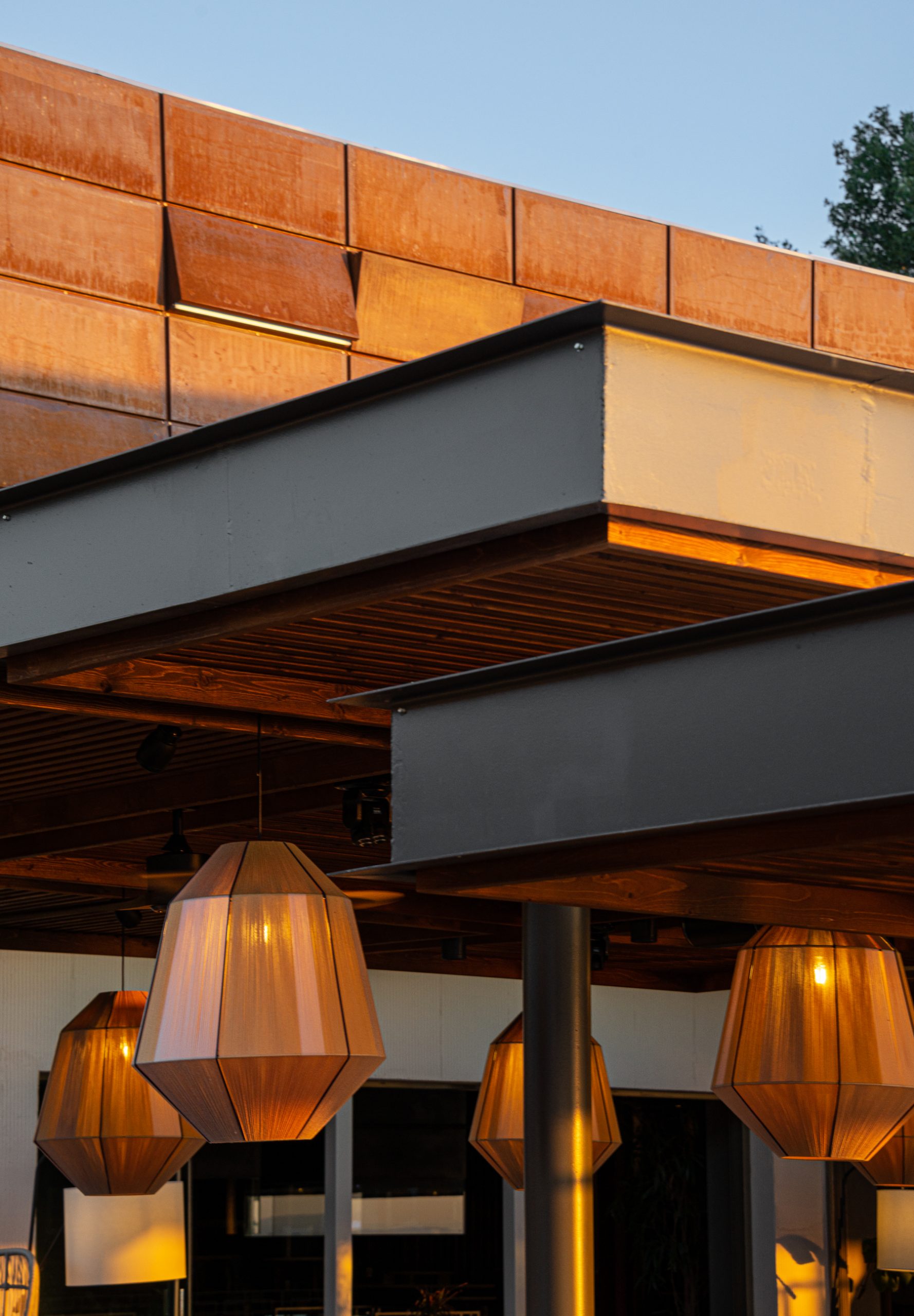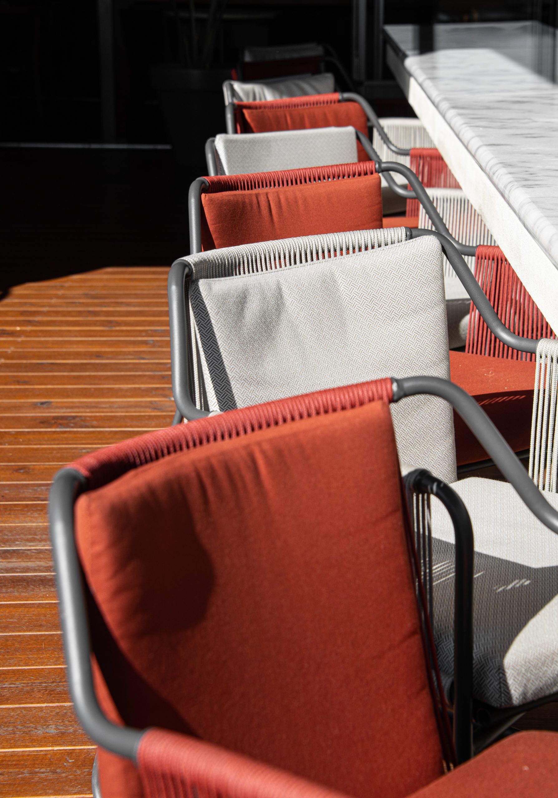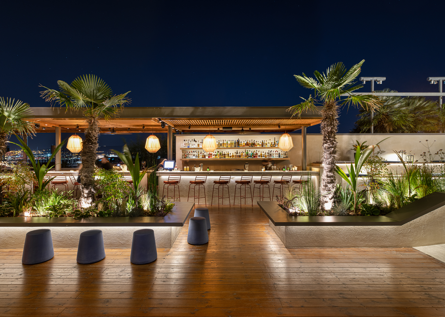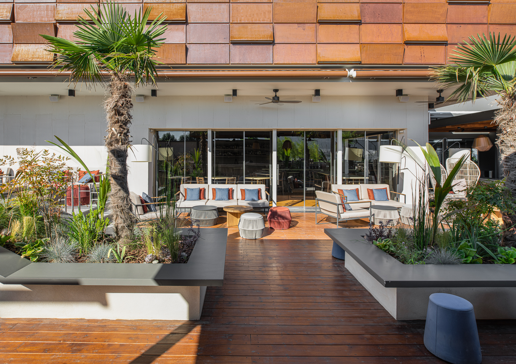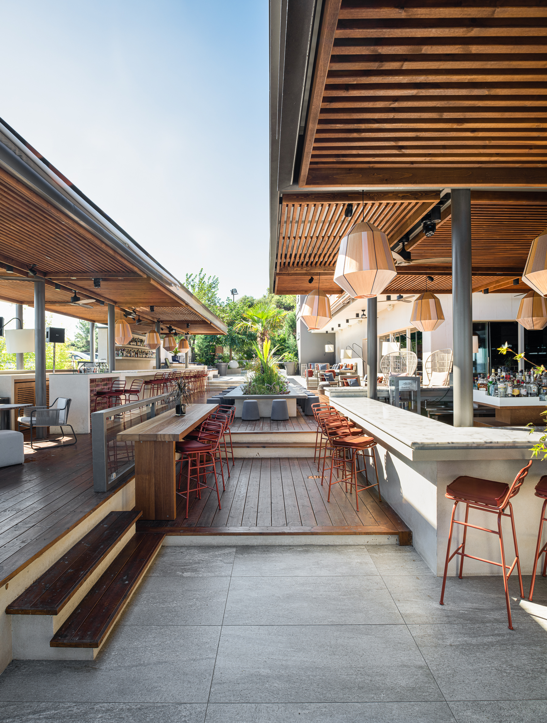 Each visitor goes through a journey upon arriving the site. First point of arrival is the entrance, where large Corten slabs that look like oxidised iron, along with blooming plants, welcome you and lead you down a path to the various sensations that nature can offer. Organic materials are being used in the whole promenade from the entrance, up until the sea front. Timber floors and pergolas, candle lit granite surfaces and tables, outdoor gas fire pits, a rich pal coloured palette of textiles, and a vast selection of plants and trees, make the visitor experience a connection to the earth and in the same time feel the unique and powerful identity of the establishment.
