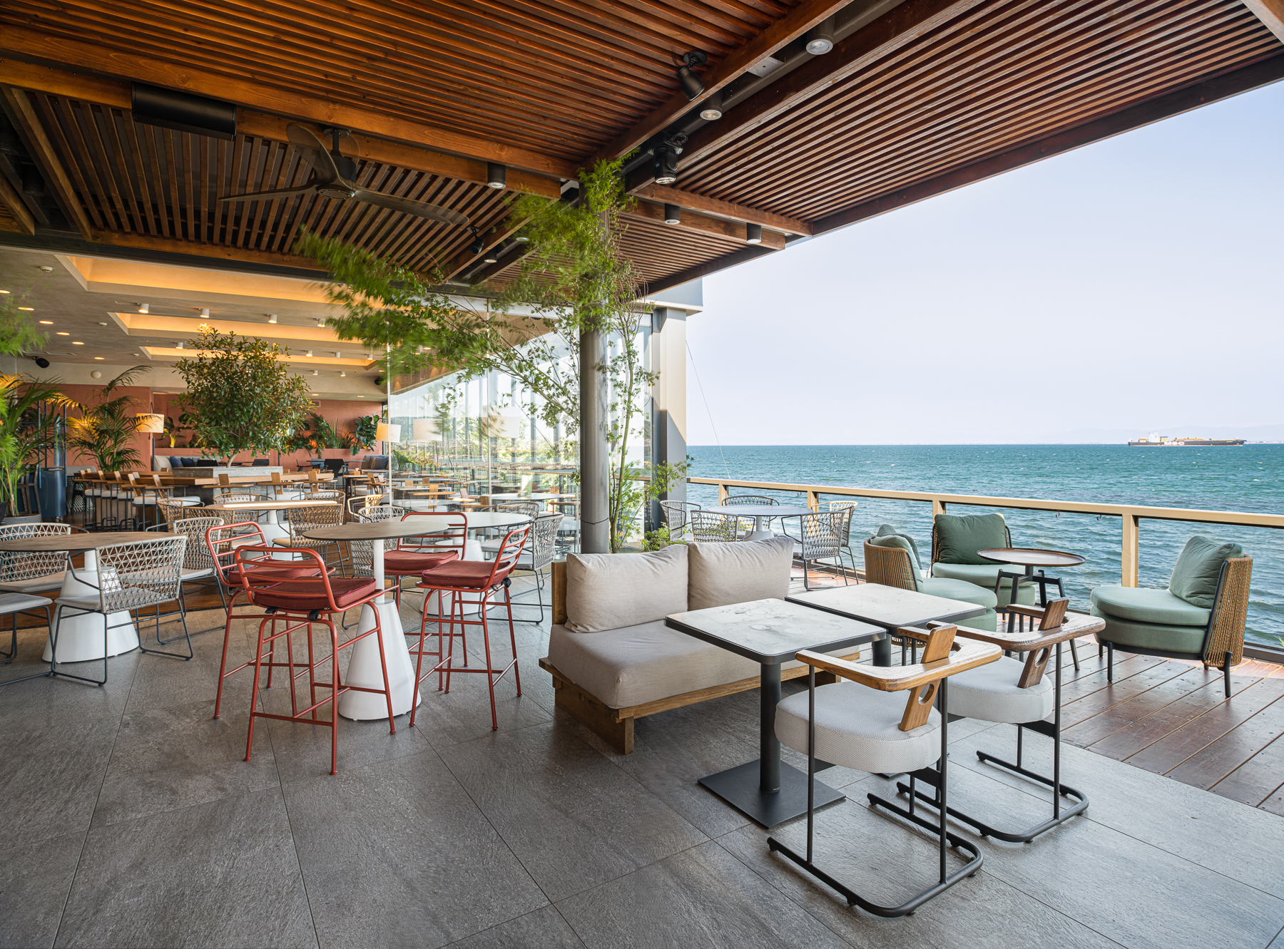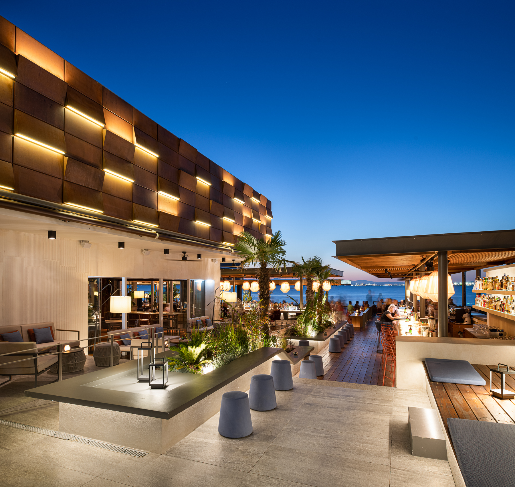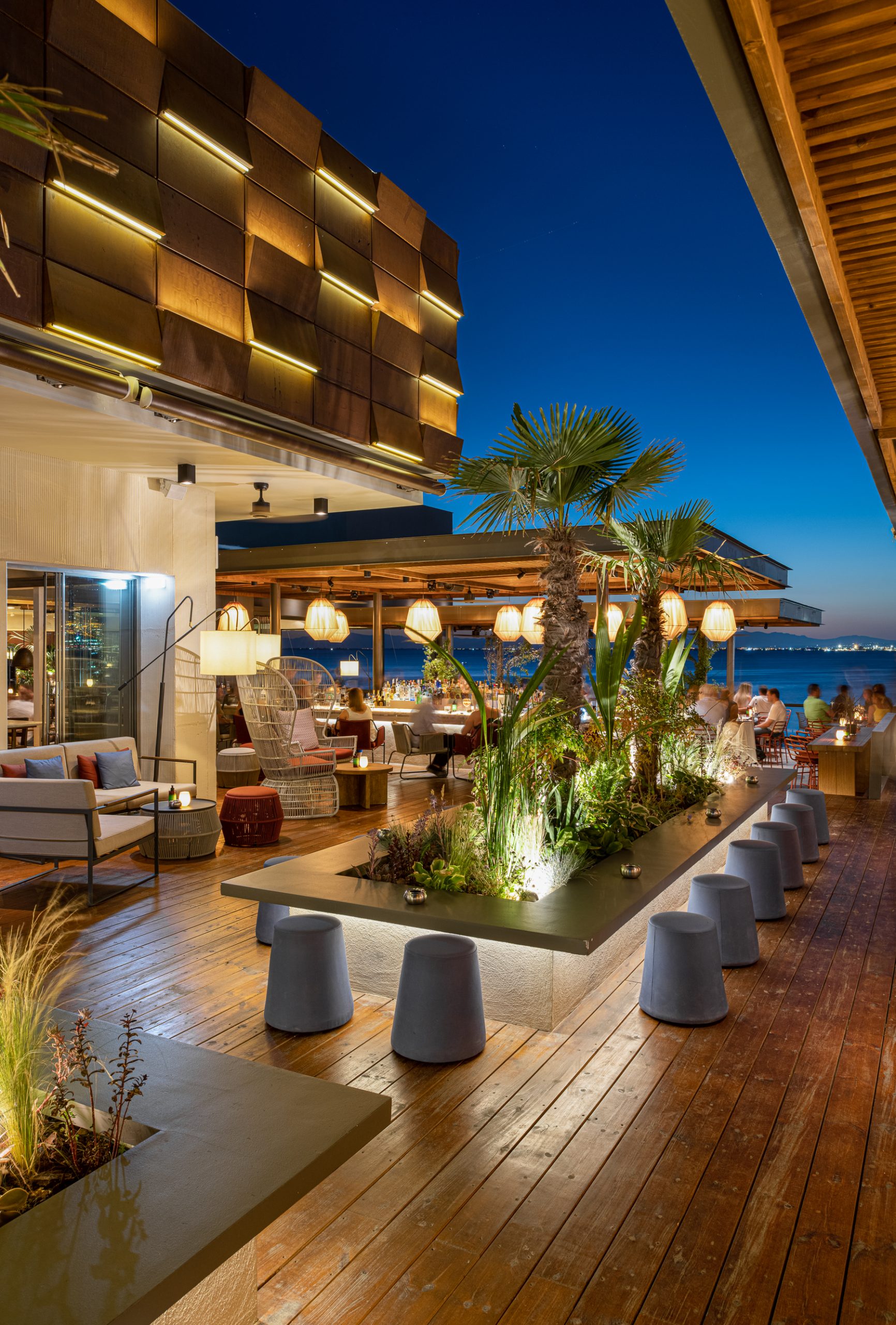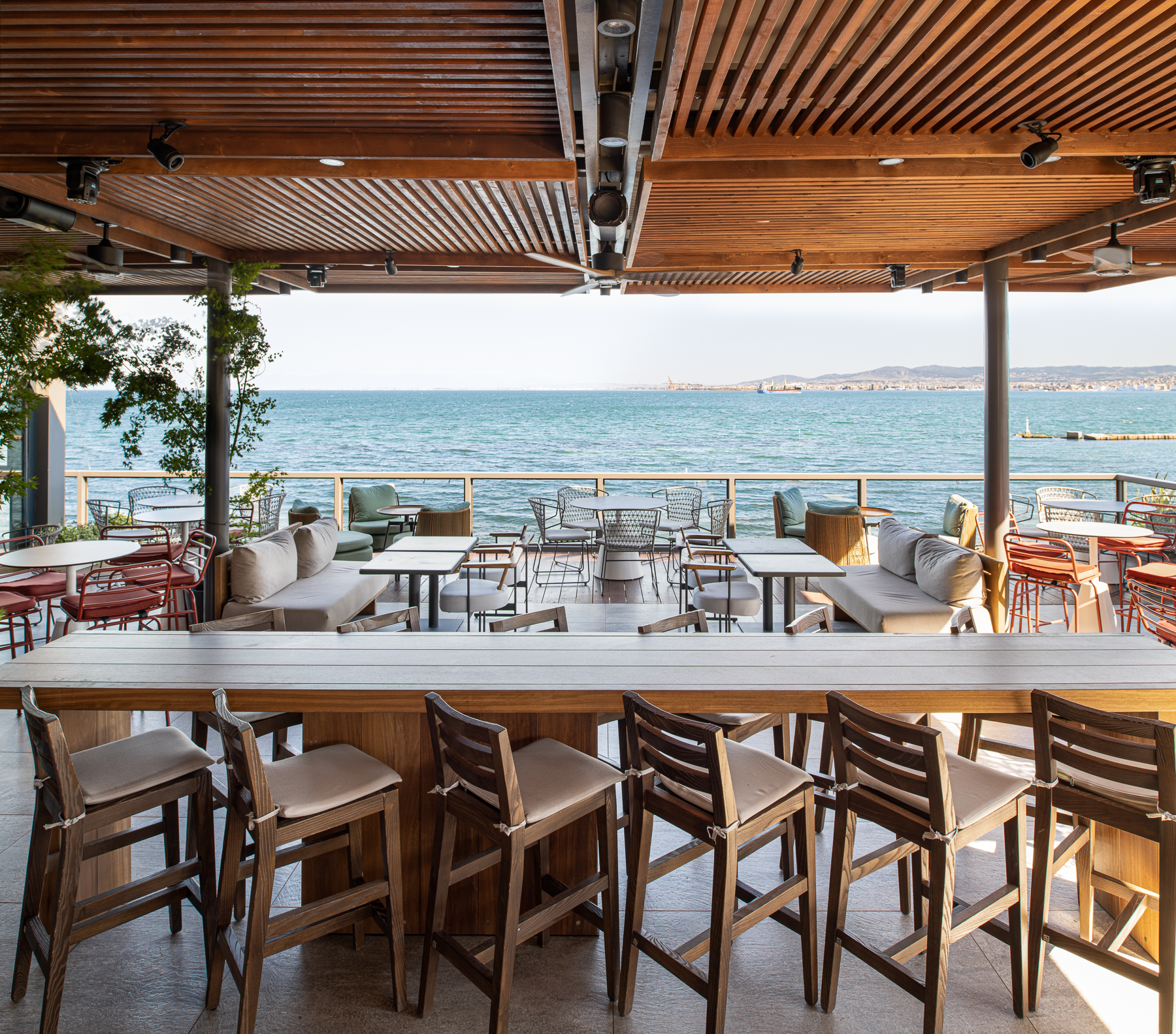 Les Zazous is a luxurious bar and restaurant, situated in the magnificent sea front of Karabournaki, Kalamaria in the city of Thessaloniki. It takes advantage of the surrounding natural beauty and blends in perfectly with the environment. Big openings offer breath taking views towards the sea and allow for the whole site to be filled with natural light.